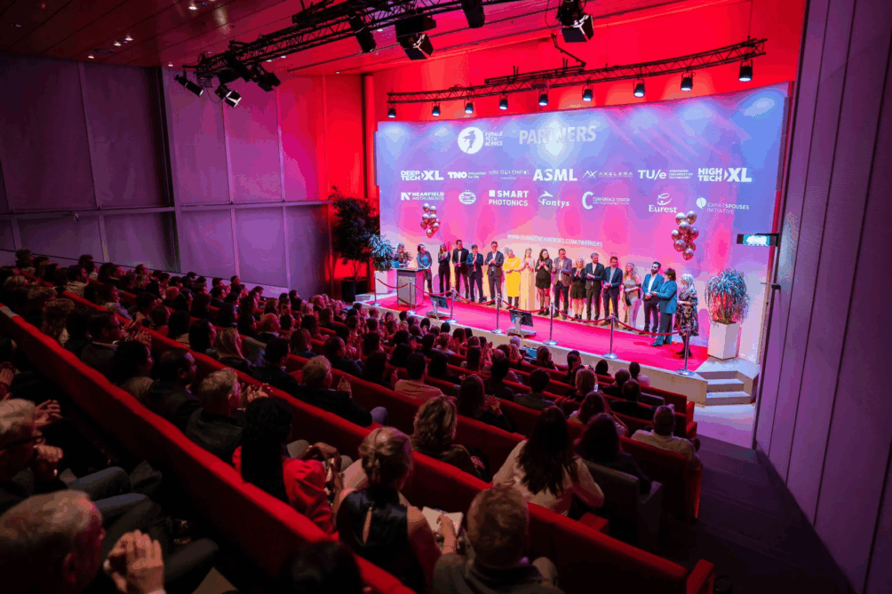 Het High Tech Campus Conference Center werd omgetoverd van een sobere bedrijfsvergaderruimte tot gala-avond, met video’s, een walk of fame met sterren voor elk van de genomineerden van Fe+male Tech Heroes, ballonnen, champagne en natuurlijk een rode loper.