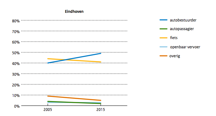 Het gebruik van de fiets in het woon-werkverkeer is in Eindhoven de laatste 10 jaar gedaald, terwijl het autogebruik behoorlijk steeg. Daarmee wijkt Eindhoven af van de overige grote steden. In Amsterdam, Rotterdam, Den Haag en Utrecht steeg het fietsgbruik juist en daalde het autogebruik.