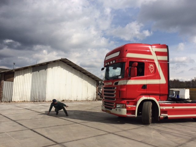 Met sierlijke bewegingen trekt Huub Smit een handschoen aan. Hij zet een stapje achteruit en wenkt langzaam, alsof hij trekt aan een onzichtbaar touw. Met ronkende motor racet er een vrachtwagen zijn kant op. De man steekt zijn hand op, stop. Schokkend en piepend komt de vrachtwagen tot stilstand. Wat volgt is een kat en muis spel: vrachtwagen wordt teruggedrongen door de man, dan moet de man weer rennen voor de vrachtwagen. Wie heeft de controle? De vrachtwagen of de man? Dat blijft de vraag.