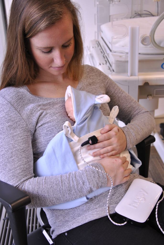Aarzelend en heel voorzichtig loopt Sylvie Claes een babykamer van het Maxima Medisch Centrum binnen. Het is voor haar de eerste keer dat ze ‘haar’ Hugsy in gebruik ziet. In het bed voor haar ligt een moeder met op haar borst een te vroeg geboren baby gewikkeld in een deken. Het dekentje helpt om een band tussen couveusebaby en moeder op te bouwen. Omdat de moeder niet altijd in het ziekenhuis bij haar pasgeboren kindje kan zijn, heeft Claes, samen met haar teamleden Hugsy bedacht. Door moeders geur in de stof en een speciale speaker die de hartslag van de moeder nabootst, heeft de baby toch het gevoel dat ze altijd in de buurt is. Hugsy simuleert en maakt kangeroo care makkelijker. Kangeroo care is een manier van zorgen voor te vroeg geboren baby’s, het idee erachter is dat baby’s beter en sneller ontwikkelen als ze skin-to-skin door de ouders worden vastgehouden.