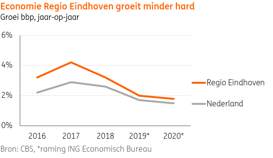 Kijkend naar de beeldbepalende bedrijven in de hightech industrie en het aanverwante cluster van bedrijvigheid zijn de signalen voor 2020 wel wat gemengd. Onder andere Philips geeft aan belemmeringen te ervaren van de handelsoorlog en de daling van de Duitse autoproductie zet ook de afzet bij toeleveranciers onder druk. Vanuit machinebouwers en de markt voor halfgeleiders zijn er volgens ING echter ook positieve geluiden. “De economie in de wereld om ons heen koelt wel af maar er is nog geen stagnatie. Doordat veel huishoudens in de regio profiteren van stijgende lonen en lastenverlichting loopt een belangrijke impuls voor de regionale economie via de bestedingen in winkels, horeca en bij dienstverleners.”