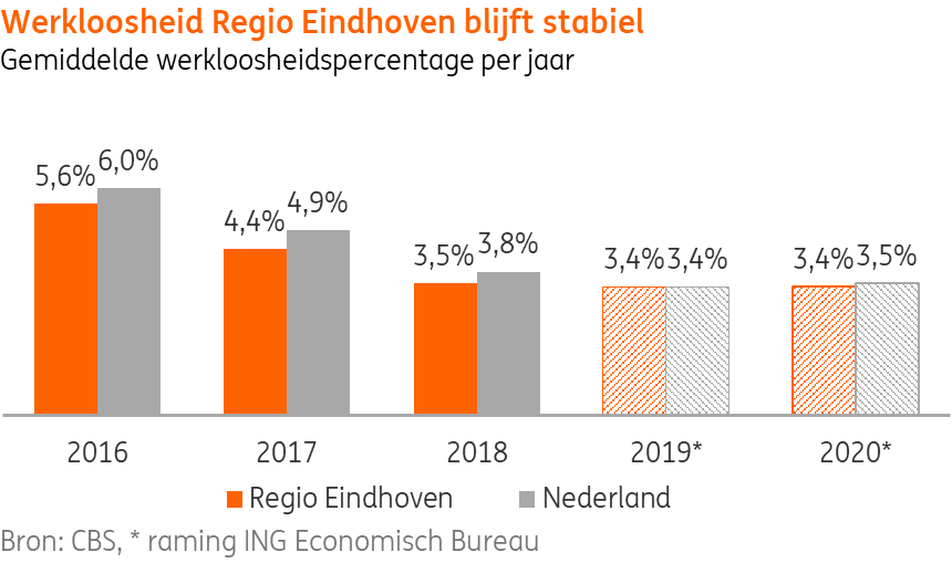 Met een verwachte economische groei van 1,8% zet de regio Brainport Eindhoven ook in 2020 de opgaande lijn door, zij het in een gematigder tempo dan in voorgaande jaren. Dat schrijft Sector- en regio-econoom Thijs Geijer van ING in de update van december. Veel werkenden gaan er financieel op vooruit en door die extra bestedingsruimte kunnen sectoren als de detailhandel, horeca en persoonlijke dienstverlening groei tegemoet zien. De regionale werkloosheid blijft stabiel op 3,4% in 2020.