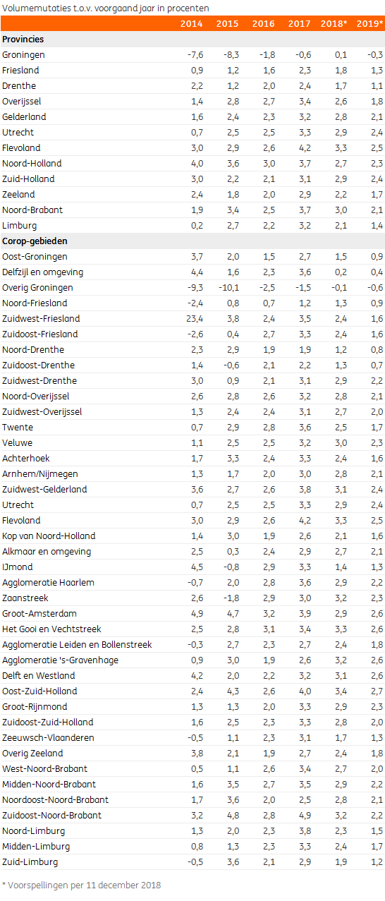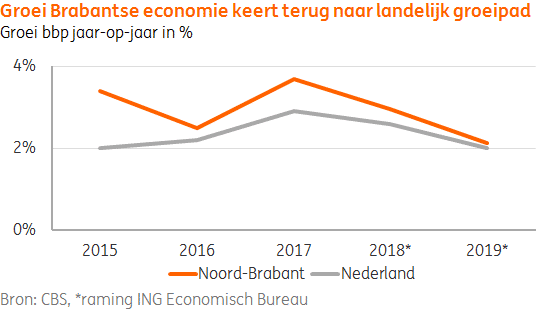 Onzekerheden in het buitenland maken de eindklanten van industriële producenten en transportbedrijven wat terughoudender, stelt ING vast. Ook andere sectoren zoals bouw, groothandel en zakelijke dienstverlening groeien minder snel. “De economische dynamiek blijft echter groot, in 2019 zorgen onder andere de oplevering van nieuwe distributiecentra zoals voor de Bijenkorf en Lidl, de groei van de onderhoudsactiviteiten voor de JSF en de doorontwikkeling van de tech-campussen bij Eindhoven voor een impuls.