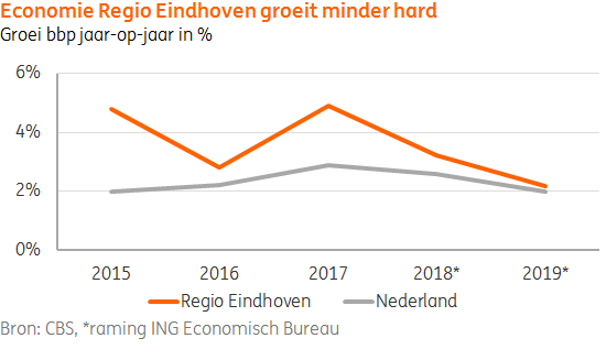 Door een reeks economisch sterke jaren ligt de productie bij veel beeldbepalende bedrijven in de regio Eindhoven op recordhoogte. In 2019 vertraagt de groei zowel bij op het binnenland gerichte als de exporterende sectoren. De sterke opleving in de hightech industrie verliest wat aan vaart en dat werkt door in de groeiverwachtingen van een tech regio als Eindhoven. Met een verwachte groei van 2,2% in 2019 is de regio niet langer meer landelijk koploper; die positie gaat straks naar Oostelijk Zuid-Holland. Ook Brabant moet genoegen nemen met een plek bij de middenmoot; Flevoland voert hier de lijsten aan.