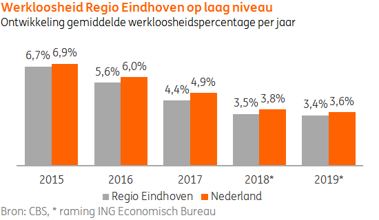 De economische groei in Brabant en de regio Eindhoven is in 2019 nog steeds groter dan het landelijk gemiddelde, maar de verschillen worden een stuk kleiner. Ook zijn er volgend jaar naar verwachting verschillende andere regio’s die beter scoren. De verwachte economische groei in 2019 bedraagt 2,2% voor Eindhoven, 2,1% voor Brabant en 2% voor heel Nederland. Na een serie sterke jaren komt de groei daarmee meer in lijn met het landelijk gemiddelde. De sterke opleving in de hightech industrie verliest aan kracht en dat werkt door in de regionale groeiverwachtingen. Ook andere sectoren groeien wat minder hard. De regionale werkloosheid daalt naar 3,4% in 2019. Dat blijkt uit de ramingen die ING vandaag bekendmaakte.