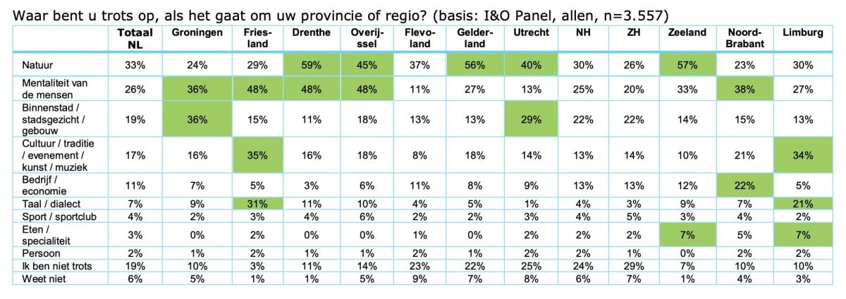 Het onderzoek laat grote verschillen zien naar provincie: de natuur wordt vooral gewaardeerd in Zeeland, Gelderland en Drenthe. De mentaliteit van de mensen is een belangrijke verbindende factor in Friesland, Drenthe en Overijssel. Binnenstad en gebouwen maken inwoners van Groningen en Utrecht vaak trots. Trots op cultuur en traditie is men bovengemiddeld in Friesland en Limburg. Taal of dialect zijn trotsmakers in Friesland en Limburg (waar ruim de helft tot twee derde die taal altijd of meestal ook spreekt). En voor Brabant geldt dus dat het – innovatieve – bedrijfsleven wordt gewaardeerd.