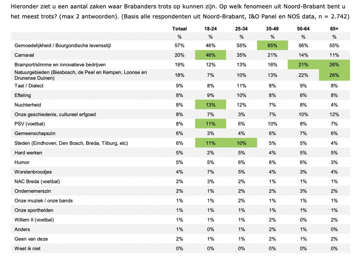 Activiteiten rond innovatie en bedrijvigheid vormen vooral voor Brabanders reden om trots te zijn op hun provincie. Nergens anders in Nederland worden deze elementen zo vaak genoemd als gevraagd wordt naar aspecten waar iemand trots op kan worden. Dat blijkt uit een peiling van I&O Research in opdracht van de NOS.