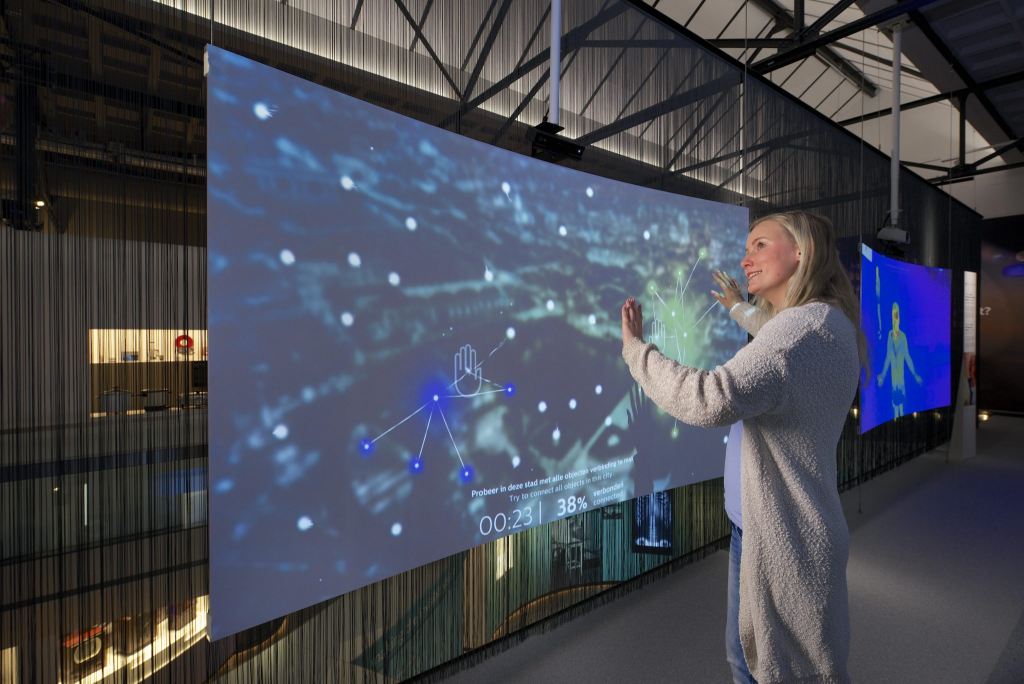 Het is tijd geworden om over te steken naar de andere kant van de ruimte. Daar staat de volgende uitdaging alweer te wachten. Op het scherm staan een stuk of dertig puntjes die jij met je handen moet verbinden.