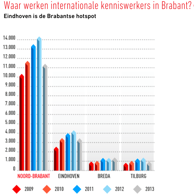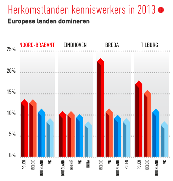 Eindhoven springt eruit als belangrijkste woon- en werkgemeente, op afstand gevolgd door Tilburg en Breda. Het sterk gespecialiseerde high-tech profiel van de stad, met internationaal opererende bedrijven als Philips, NXP en ASML, biedt interessante loopbaanmogelijkheden voor met name technisch geschoold buitenlands talent. Opvallend is overigens dat een relatief grote groep kenniswerkers die wérkt in de regio Eindhoven in de regio Amsterdam woont: in 2014 bijna 11 procent.