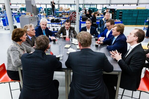Willem-Alexander kijkt zijn tafelgenoten vragend aan, hoe zit dat juridisch? Geerts lachend: “In deze regio beginnen we gewoon, dat vastleggen komt later wel.” Jorritsma springt bij: “Dit is wederom een kwestie van vertrouwen en open communicatie. Dat is soms eng en mensen steken hun nek uit, maar elkaar kunnen vertrouwen is essentieel voor het ecosysteem.” De koning knikt en Kersten gaat verder waardoor het volgens hem komt dat maakbedrijven steeds hogere kwaliteit leveren: