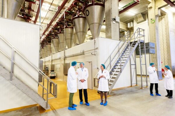 Veel bedrijven in de maakindustrie lukt het steeds moeilijker goed personeel te vinden. Daarover praat koning Willem-Alexander in de personeelsruimte van Huijbregts groep werknemers, een student en vertegenwoordigers uit het onderwijs. Maar eerst een rondje door de fabriek van de poedergigant uit Helmond. Koning of niet, ook Willem-Alexander moet zich in een fabrieksjas hijsen. Compleet met haarnetje en plastic slofjes. Huijbregts levert mengpoeders voor de voedselindustrie. Specerijen, smaak -en kleurstoffen, vitaminen en zout om maar wat te noemen. Zo’n 350 ton poeders per dag gaat er door het mengsysteem, dat alles automatisch mengt. De mengsels komen terecht in ovenfrites, in vleesvervangers, snacks, worstjes, soep en nog tientallen voedingsmiddelen.