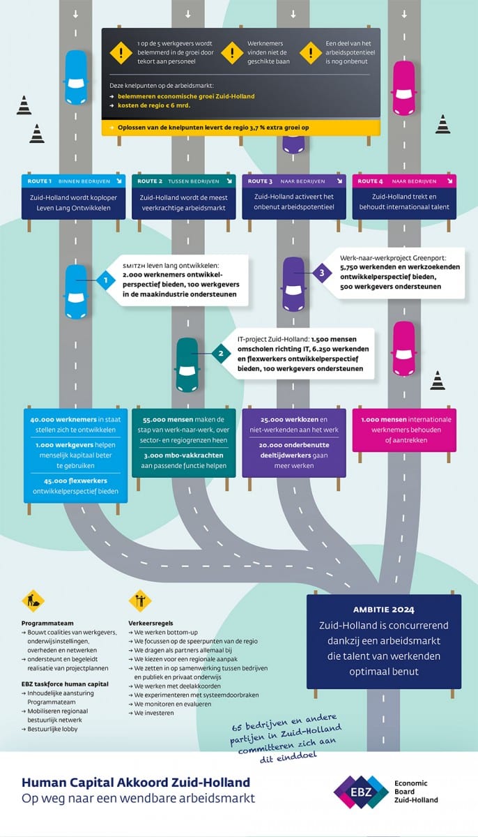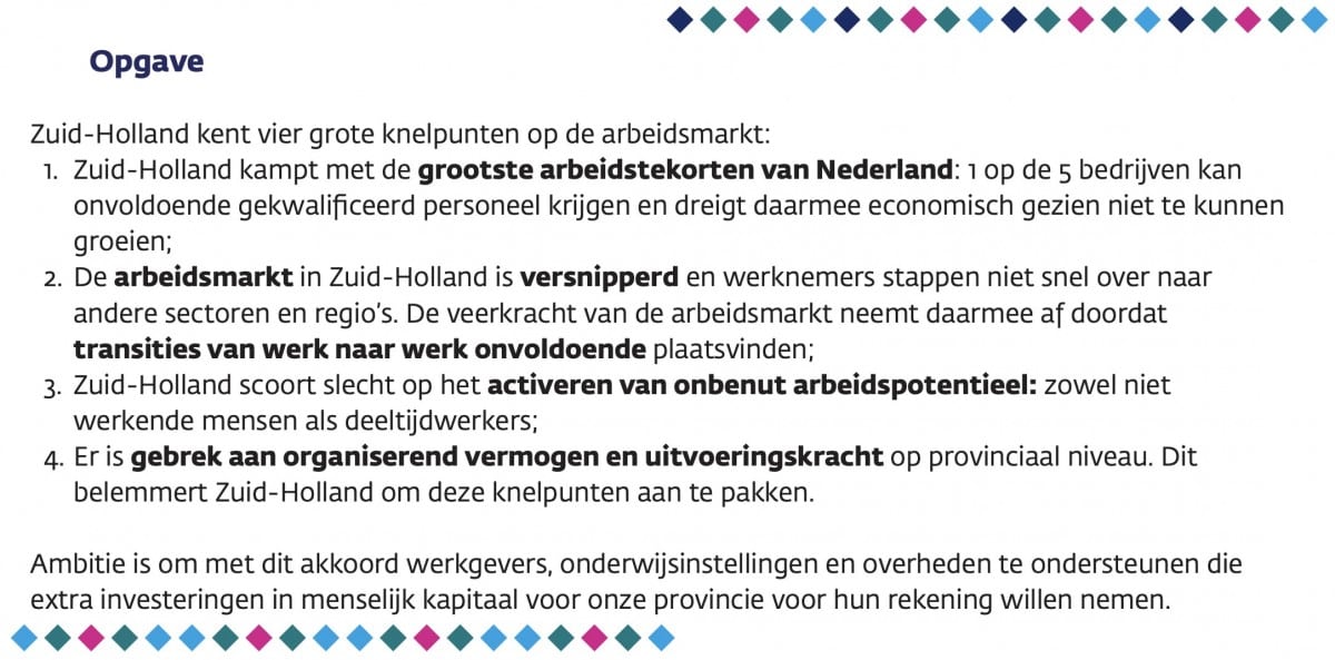 Uit een arbeidsmarktonderzoek bleek vorig jaar dat de knelpunten op de Zuid-Hollandse arbeidsmarkt de regio zo’n € 6 miljard kosten. Twintig procent van de bedrijven kan momenteel onvoldoende gekwalificeerd personeel vinden. Tegelijkertijd is er een groot onbenut arbeidspotentieel: 27.000 mensen zouden (meer) kunnen gaan werken, vergeleken met het Nederlandse gemiddelde. De regio kan volgens het onderzoek rekenen op een extra groei van 3,7 % als ze de knelpunten op de arbeidsmarkt aanpakt.