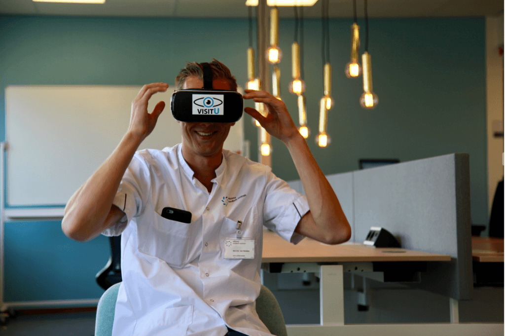 De snelheid waarmee Van Rooijen financiering voor VisitU kon regelen, is een verademing vergeleken bij de procedures die hij doorloopt voor subsidie-aanvragen voor zijn onderzoekswerk. “Voor startups in de medische sector is het relatief makkelijk om investeerders te vinden.” En Nederland is sowieso een goed land voor startende bedrijven, vindt hij. Wat lastig blijft, is dat alles gevalideerd moet worden. Hij vertelt over een meisje dat via de virtual reality bril kon ‘aanschuiven’ bij het kerstdiner van haar familie. Onbetaalbaar, maar ja, hoe maak je wetenschappelijk hard dat dat echt het verschil maakt? “Aan welzijn hangt geen prijskaartje.” Toch is dat bewijs belangrijk en doet hij momenteel, samen met studenten van de Technische Universiteit Eindhoven, Radboud Universiteit Nijmegen en Fontys Hogescholen, onderzoek naar de voordelen van live contact met het thuisfront.
