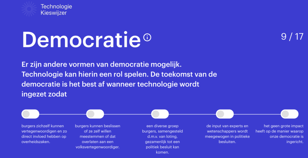 Maar anders dan andere kieswijzers vink je bij de Technologie Kieswijzer niet aan of je voor of tegen een stelling bent, maar kies je tussen vijf verschillende oplossingen voor een bepaald vraagstuk. “Met alleen stellingen sla je de complexiteit van het onderwerp plat. Een stelling als ‘ik wil meer online privacy’ zegt zo weinig. Daar zijn mensen over het algemeen wel mee eens. Veel belangrijker is hoe dat eruit moet zien.”