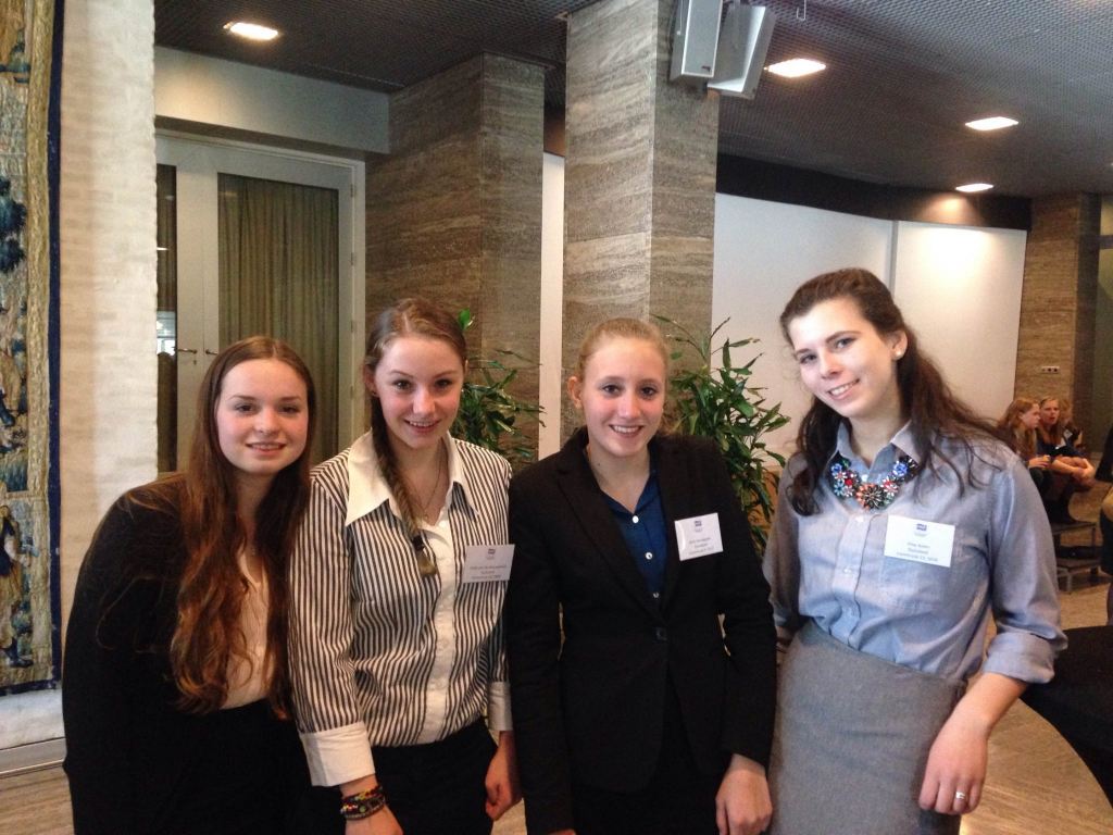 Hannah van Haeren en Valerie Verspeeten zijn er voor de eerste keer bij als begeleiders, ze komen uit Gent. ,,Onze kinderen doen mee om zich te ontplooien, door projecten als deze worden ze kritischer. Ze leren nadenken over zaken en zich te uiten. Het maakt ze weerbaarder”, vertellen de Belgische leerkrachten. ,,We zijn verrast dat het zo officieel is” – beiden zijn niet gekleed volgens de officiële dresscode. Maar zo leren ze wel om te gaan met protocollen die gelden in de politiek. “Het is erg mooi om van deze locatie gebruik te mogen maken. Erg tof van de gemeente. Ook de zorg van het Bekkers Lyceum is goed, alle leerlingen slapen in gastgezinnen of in een blokhut.”