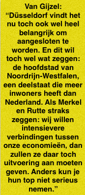 Van Gijzel: “Düsseldorf vindt het nu toch ook wel heel belangrijk om aangesloten te worden. En dit wil toch wel wat zeggen: de hoofdstad van Noordrijn-Westfalen, een deelstaat die meer inwoners heeft dan Nederland. Als Merkel en Rutte straks zeggen: wij willen intensievere verbindingen tussen onze economieën, dan zullen ze daar toch uitvoering aan moeten geven. Anders kun je hun top niet serieus nemen.”