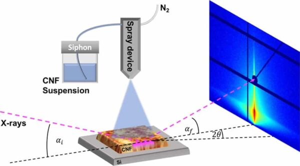 Wetenschappers van het Deutsches Elektronen-Synchrotron DESY en het KTH Royal Institute of Technology in Stockholm hebben nu een nieuw sprayprocedé ontwikkeld om op industriële schaal zeer gelijkmatige laagjes cellulose nanovezels (CNF) te produceren. Hierbij worden cellulose nanovezels, die gemiddeld 500 nanometer (een miljoenste millimeter) lang zijn en 3 tot 5 nanometer dik, in een waterhoudende draagvloeistof op een siliciumdrager gespoten.