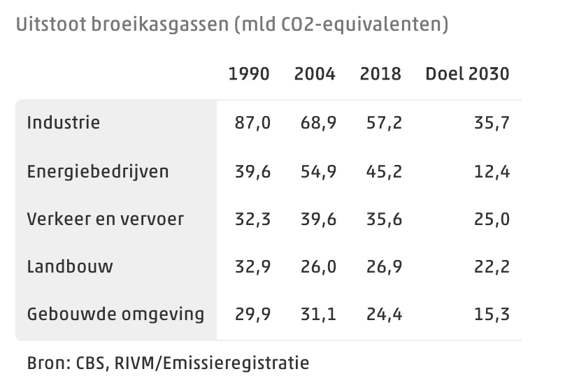 In 2018 stootte de industrie 30 miljard CO2-equivalenten minder uit dan in 1990. De sectoren gebouwde omgeving (stoken van aardgas voor verwarming) en landbouw realiseerden allebei een reductie van 6 miljard CO2-equivalenten. Bij de elektriciteitsbedrijven en in de sector mobiliteit (binnenlands verkeer en vervoer) was er een toename van 6 miljard en 3 miljard CO2-equivalenten. Alle vijf sectoren zijn omvangrijker geworden.