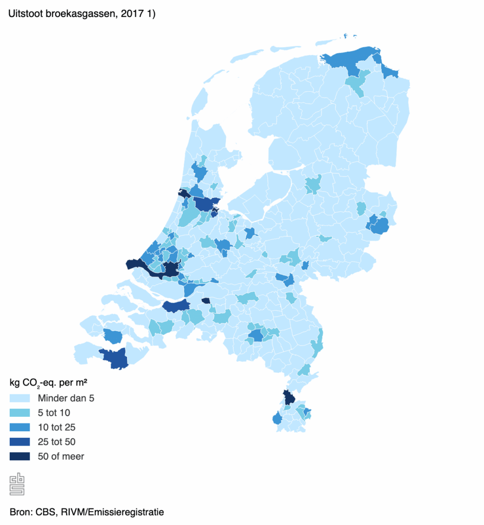 Per vierkante meter is de uitstoot van broeikasgassen in Velsen 42 keer groter dan gemiddeld in Nederland (5 kg CO2 per vierkante meter). In Velsen zit staalfabrikant Tata Steel en er staat een elektriciteitscentrale die de restgassen uit de hoogovens benut. Andere gemeenten met een hoge uitstoot per vierkante meter zijn Geertruidenberg (Amercentrale, 26 keer grotere uitstoot dan gemiddeld), Rotterdam met zijn raffinaderijen, chemische industrie en elektriciteitscentrales op en nabij de Maasvlakte (20 keer groter), Diemen met zijn elektriciteitscentrales (17 keer groter) en Sittard-Geleen (chemiebedrijf Chemelot, 16 keer groter). Al deze gemeenten hebben hun hoge score te danken aan een hoge CO2-uitstoot. Sittard-Geleen heeft daarnaast ook een hoge uitstoot van lachgas (productie van caprolactam, grondstof voor nylon). CO2 heeft met 85 procent het grootste aandeel in de totale broeikasgasuitstoot, gevolgd door methaan (9 procent), lachgas (5 procent) en de F-gassen (1 procent).