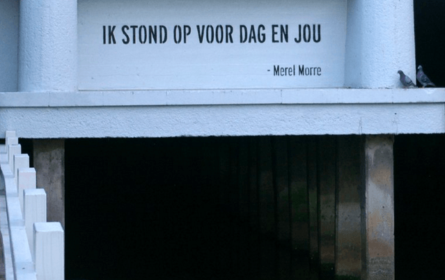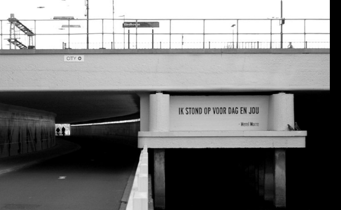 Het was het best gelezen artikel van maart: een fotoreeks van de objecten die de stad een wat vrolijker beeld geven. Blijmakers worden ze genoemd. Deze week is er weer eentje bijgekomen. De beroemde tekst “Ik stond op voor dag en jou” stond al ooit op de stoeptegels bij het station, maar heeft nu een vaste plek gekregen voor de Dommeltunnel onder het spoor.
