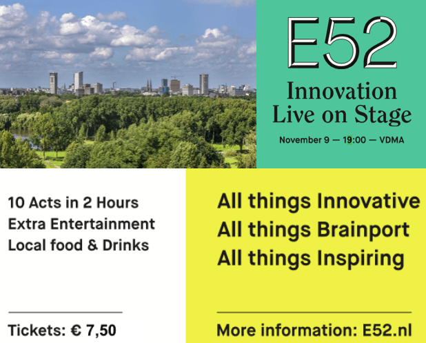 Met E52 Live! brengt E52 tien in het oog springende Eindhovense innovaties live op het podium. Met demonstraties, interviews en veel interactie krijgt het publiek een goede indruk van de vernieuwingsdrang van de regio. Een van de aanwezigen krijgt aan het einde van de avond zichzelf – in een 3D geprinte versie – mee naar huis.