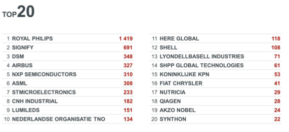 De ontwikkeling van octrooiaanvragen in technische sectoren komt ook goed tot uiting in de ranglijst van Nederlandse bedrijven. Koninklijke Philips bleef opnieuw de meest actieve aanvrager van Nederland met 1.419 Europese octrooiaanvragen in 2020 (een daling van 8 procent ten opzichte van het voorgaande jaar), gevolgd door Signify met 691 aanvragen (+5,3 procent ), DSM 348 (+1,5 procent ), Airbus 327 (- 38,3 procent ) en NXP 310 (-11,7 procent ).