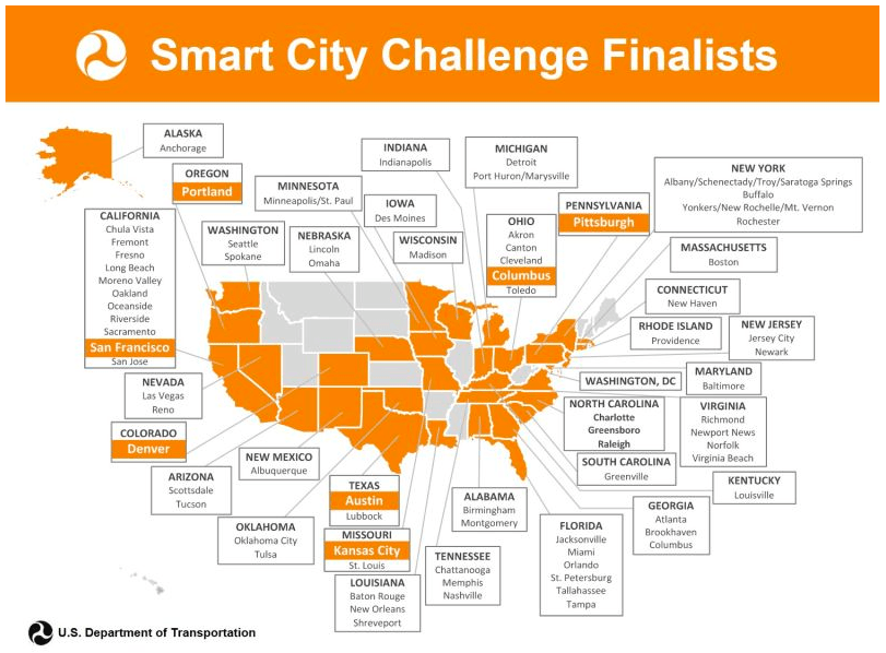 78 steden hebben zich vorig jaar gemeld voor de Smart City Challenge (zie plaatje boven dit artikel). Dit weekend werden tijdens het SXSW festival in Austin de zeven steden bekendgemaakt die in de finale zitten. Het gaat om: