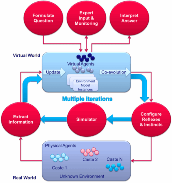 De sensoren worden naar de werkelijke omgeving gestuurd om individueel informatie te verzamelen, waarna ze worden teruggewonnen en hun gegevens worden opgehaald. De gecombineerde gegevens worden vervolgens ingevoerd in een tweede, gecentraliseerd en minder beperkt mainframe dat geavanceerde kunstmatige intelligentiemethodes toepast op virtuele agenten in een virtuele wereld. De leerervaringen en “kennis” die hieruit volgen kunnen vervolgens worden gebruikt om de reflexen en instincten van de sensoren te herprogrammeren en zo hun nauwkeurigheid of relevantie op een evolutionaire manier te verbeteren.