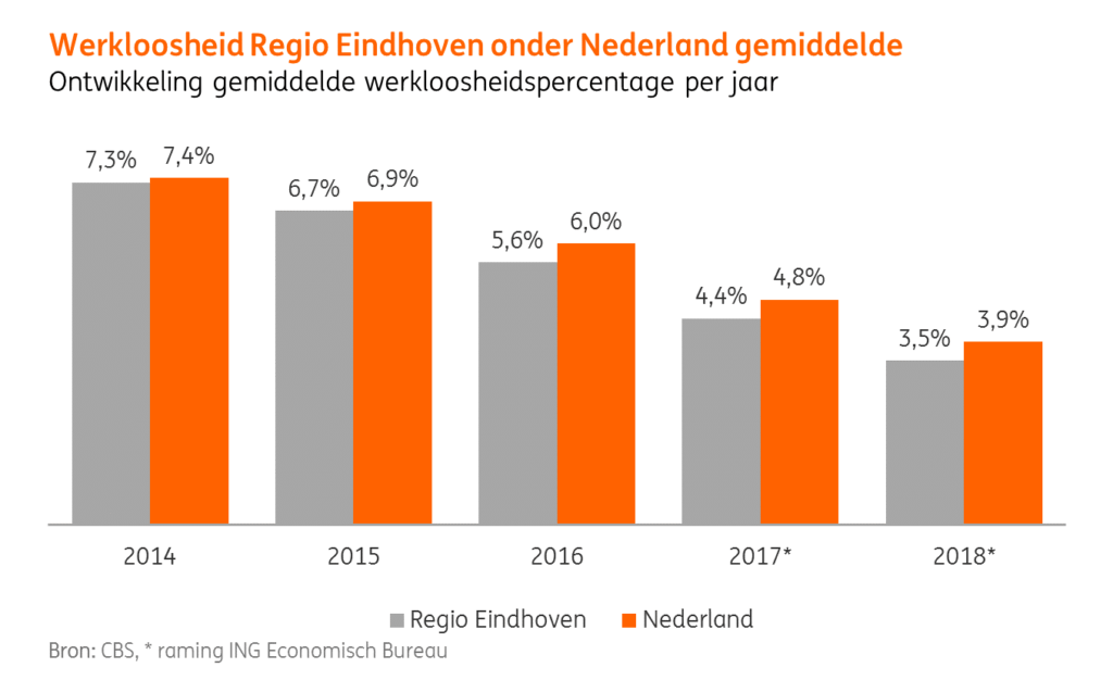 De belangrijkste reden dat de werkloosheid daalt, is dat het aantal vacatures in het afgelopen jaar omhoog is geschoten. Regionaal ging het aantal nieuwe vacatures van gemiddeld 7.500 eind 2016 naar 12.500 eind 2017. Die stijging is sterker dan landelijk en het gemiddelde voor heel Brabant. De uitdaging om het potentieel in de regio beter te benutten en mensen van buiten aan te trekken blijft onverminderd in stand, zo concludeert ING.