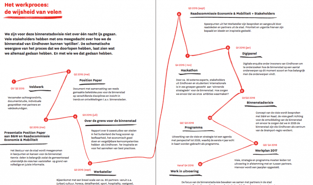 Het visiedocument over de binnenstad dat in september met de Gemeenteraad wordt besproken, maakt boven alles duidelijk dat de gemeente niemand enig beleid wil opleggen. Op zo’n beetje elke van de 64 pagina’s komen de stakeholders, de betrokkenen en de belanghebbenden aan bod. Zo is er een route getekend die aangeeft wie er tussen februari 2015 en nu allemaal in het proces is getrokken: “de wijsheid van velen”.