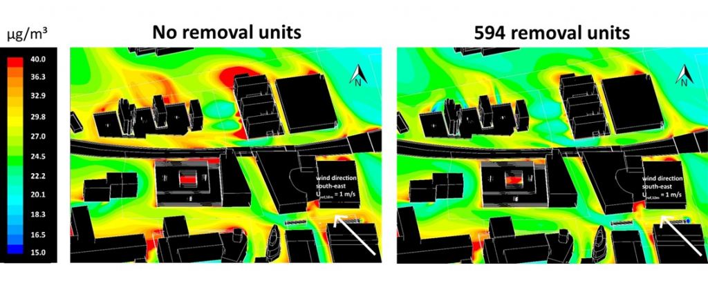 Met 99 luchtzuiveringssystemen is rond de parkeergarages veelal een vermindering van fijnstof rond 10 procent zichtbaar. Maar bij 594 luchtzuiveringsinstallaties tekent zich een veel groter gebied af, soms tot een kilometer van de parkeergarages waar minimaal 10 procent minder fijnstof is. Op bepaalde plekken loopt dit zelfs op tot boven de 40 en 50 procent minder. Blocken: “Ik had wel een effect verwacht, maar niet dat het zo fors zou zijn.” De simulaties zijn weliswaar uitgevoerd voor één bepaalde situatie, dus de effectieve concentraties kunnen – afhankelijk van bijvoorbeeld de kracht en richting van de wind en verkeersdruktes – hoger of lager zijn. “Toch concluderen we dat dit een effectieve methode is om de luchtkwaliteit te verbeteren”, aldus Blocken.