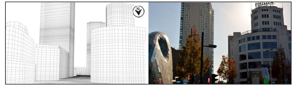 De Eindhovense onderzoekers modelleerden in groot detail de bebouwing in het stadscentrum van Eindhoven. In dit gebied, met een oppervlakte van 5.1 vierkante kilometer, namen ze de locatie van 16 ondergrondse parkeergarages op. De onderzoekers berekenden het effect op de concentratie fijnstof in de stad als met 99 of 594 luchtzuiveringssystemen de fijnstof in deze parkeergarages wordt afgevangen.