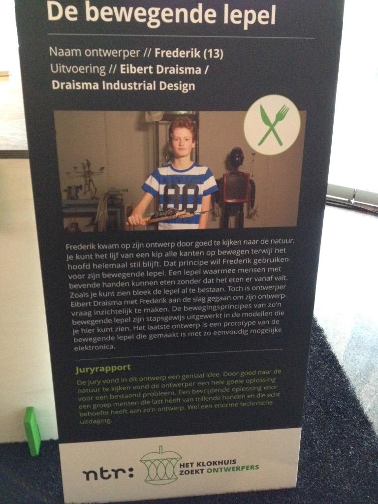 Frederik deed mee aan een ontwerpwedstrijd van het televisieprogramma Klokhuis. In totaal deden daar 1100 deelnemers aan mee. Er waren vijf categorieën, en voor iedere categorie werd één winnaar gekozen. Frederik won in de categorie ‘Iets om mee te eten‘. Zijn idee was een lepel te maken voor mensen met Parkinson, die hun trillende bewegingen corrigeert zodat ze niet knoeien.