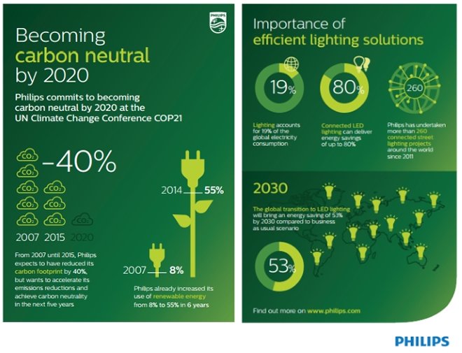 “Deze mijlpaal toont aan dat we met succes de overgang van conventionele verlichtingstechnologieën naar LED kunnen aansturen, wat een belangrijke bijdrage kan leveren aan de wereldwijde klimaatdoelstellingen”, zegt Harry Verhaar, hoofd Global Public and Government Affairs bij Philips Lighting. “Energie-efficiëntie is het laaghangende fruit – vandaag de dag verbetert de energie-efficiëntie jaarlijks met ongeveer 1,5%, maar gewoon verdubbelen tot 3% per jaar zou ons helemaal op een duurzame weg kunnen zetten.”