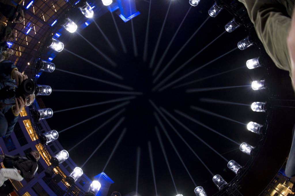 Het kunstwerk van Suk, dat de hele week op het Philips Lichtplein aan de Lichtstraat in Eindhoven te zien is, opgemaakt van een cirkel op vier meter hoog, waarin Philips-lampen zijn gemonteerd.