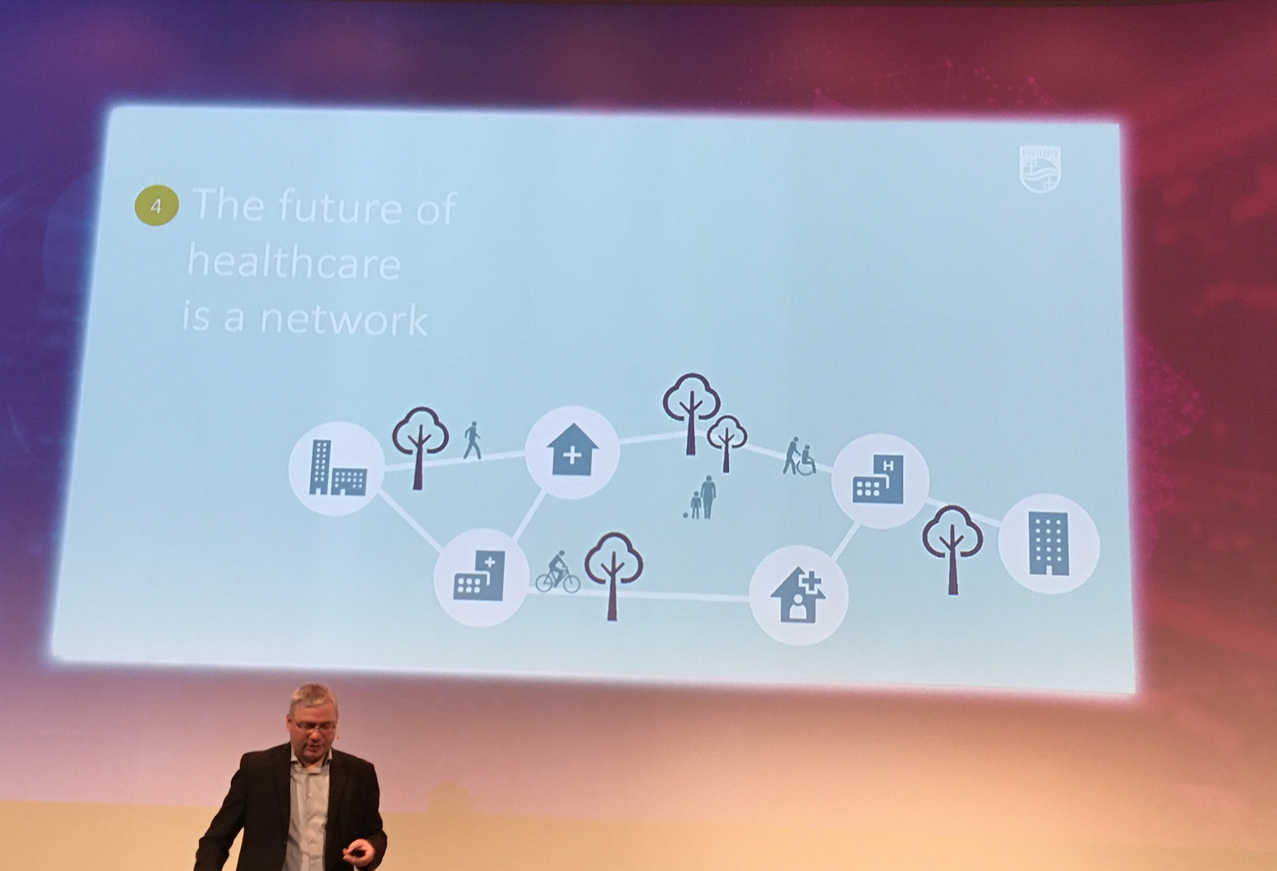 In de toekomst gaan we niet meer zo vaak als nu voor zorg naar het ziekenhuis of naar de dokter, voorspelde Christopher Busch, hoofd van de afdeling Innovatie Management bij Philips tijdens de High Tech Next in Eindhoven afgelopen week. Als je hoofdpijn hebt, bel je de dokter waarbij je gebruik maakt van een directe videoverbinding zoals we die al kennen door Facetime en Skype. De dokter vraagt dan aan de patiënt wat er scheelt. En alleen als het echt nodig is moet deze naar een kliniek toe om fysiek onderzoek te ondergaan.