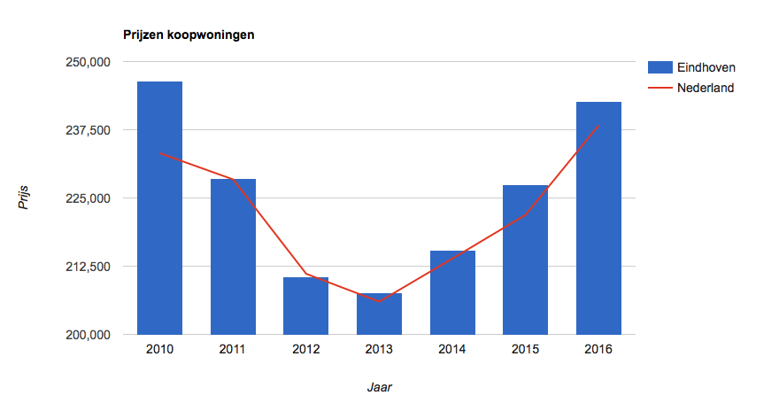 De prijzen van appartementen zijn in Eindhoven het meest gestegen. Waar de prijs voor een appartement begin vorig jaar nog 138.000 euro was, is het dit jaar gestegen naar 161.000 euro. Vrijstaande woningen zijn het minst gestegen met 2,3 procent.