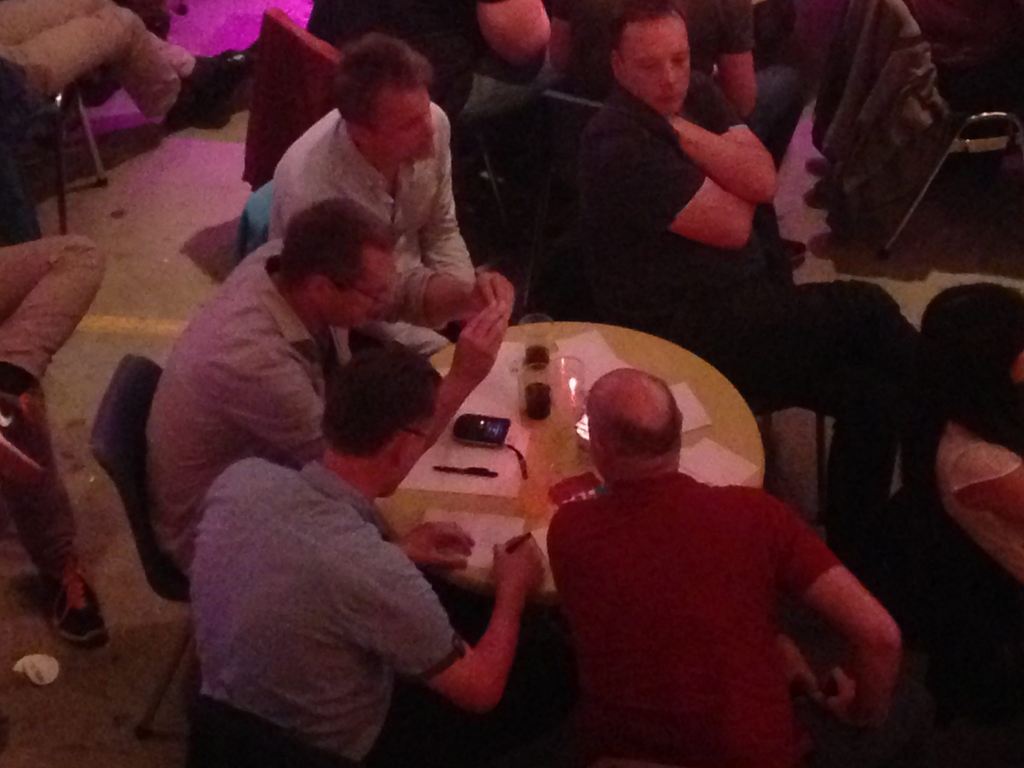 De winnaar van vorig jaar vertelde een aantal weken geleden nog dat een quiz niets met voorbereiding te maken heeft. Daar denken de heren van Sponsbob Blokbroek – zo heet het team van de Philips collega’s – totaal anders over: “Tuurlijk wel joh. Dit soort dingen kun je juist oefenen. We sturen elkaar weetjes via whatsapp en het wordt nog gekker: We hebben ook oude wetenschapsquizzen terug zitten kijken.” De oud-studiegenoten beginnen de avond goed en gaan na de eerste tussenstand aan kop. “Het gaat lekker, zie je wel dat oefenen zin heeft.”