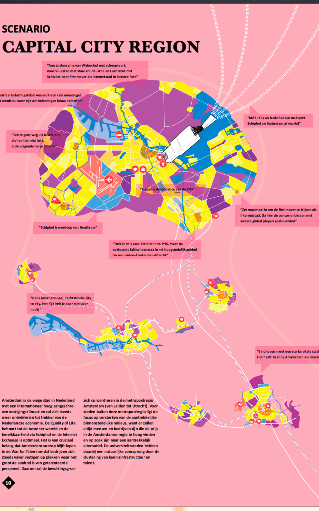 In zes afleveringen besteedt e52 aandacht aan “Het Zuidelijk Perspectief“: een onderzoek naar metropoolvorming in Nederland. De afgelopen maanden hebben Sebastian van Berkel, Jaap Modder, Jeroen Saris, Wouter Veldhuis en Sanneke van Wijk een groot aantal experts, wetenschappers, bestuurders en opiniemakers gesproken om meer grip te krijgen op de belangrijkste kansen en bedreigingen voor de ruimtelijke economische structuur van Randstad+Brainport. Op basis van deze gesprekken hebben zij vijf radicaal verschillende scenario’s uitgewerkt in mogelijke toekomstbeelden. Deze week laten we de vijf scenario’s zien, in tekst en verhelderende infografieken. Vandaag scenario 3: Capital City Region.