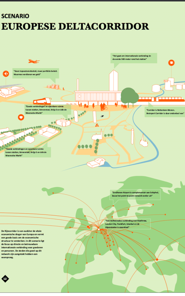 SCENARIO: De Rijncorridor is van oudsher de vitale economische drager van Europa en vormt een goede basis om de economische structuur te versterken. In dit scenario ligt de focus op een directe en betrouwbare internationale verbinding voor goederen en personen. De steden die goed op dit netwerk zijn aangehaakt hebben een voorsprong.
