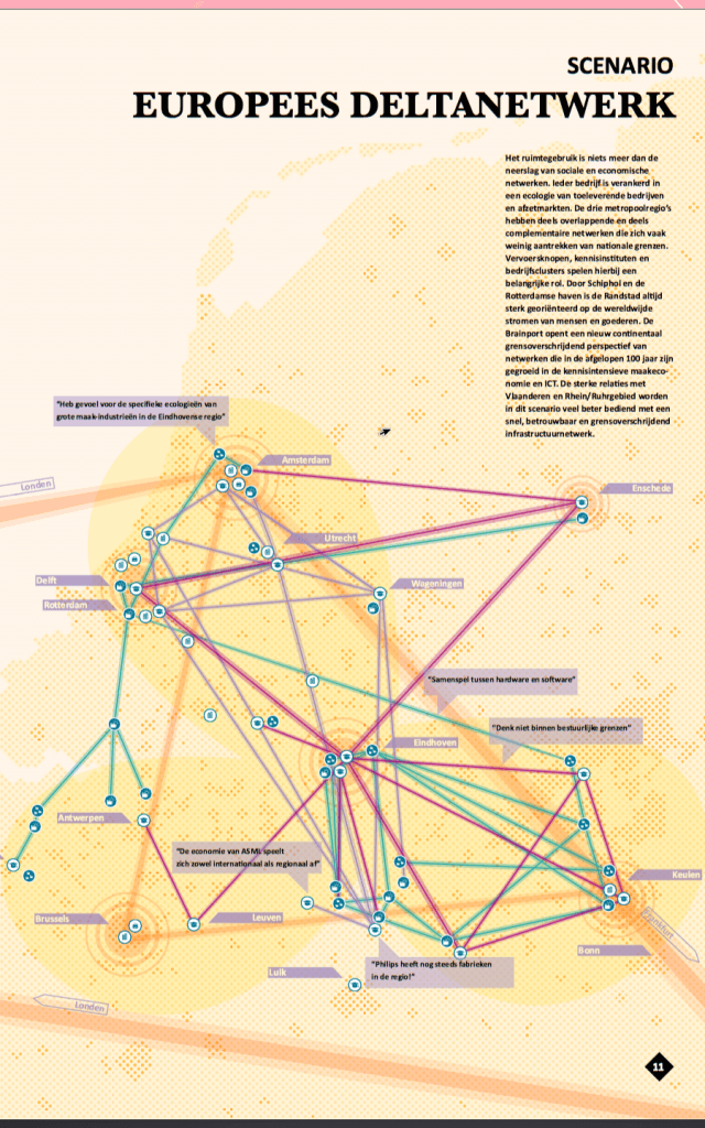 SCENARIO: Het ruimtegebruik is niets meer dan de neerslag van sociale en economische netwerken. Ieder bedrijf is verankerd in een ecologie van toeleverende bedrijven en afzetmarkten. De drie metropoolregio’s hebben deels overlappende en deels complementaire netwerken die zich vaak weinig aantrekken van nationale grenzen. Vervoersknopen, kennisinstituten en bedrijfsclusters spelen hierbij een belangrijke rol.