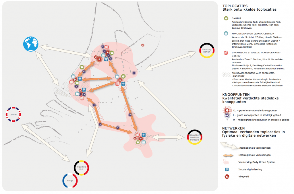 De Noordelijke en Zuidelijke Randstad en de Brainport Eindhoven vormen het economisch kerngebied van Nederland. Hier woont 37% van de Nederlandse bevolking, wordt 42% van het nationaal inkomen verdiend, worden 63% van de diploma’s in het Nederlands wetenschappelijk onderwijs behaald en vindt 50% van alle private Research & Development plaats. Hier liggen de grootste haven en één van de best verbonden luchthavens van Europa. En hier vinden internationale toonaangevende activiteiten plaats op gebieden als life science en nano-elektronica. Tegelijkertijd kan al deze bedrijvigheid, kennis en energie beter met elkaar verbonden worden.