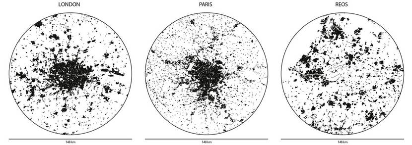 Figuur: Polycentrische structuur van het REOS-netwerk in vergelijking met Parijs en Londen.