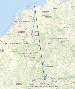 De eerste etappe (zie kaartje) gaat maandag van Schänis over Birrfeld naar Donaueschingen-Villingen, Lahr, Karlsruhe, Baden-Baden en Bad Dürkheim. Daar is dan de eerste gelegenheid voor het publiek om het vliegveld te bekijken.