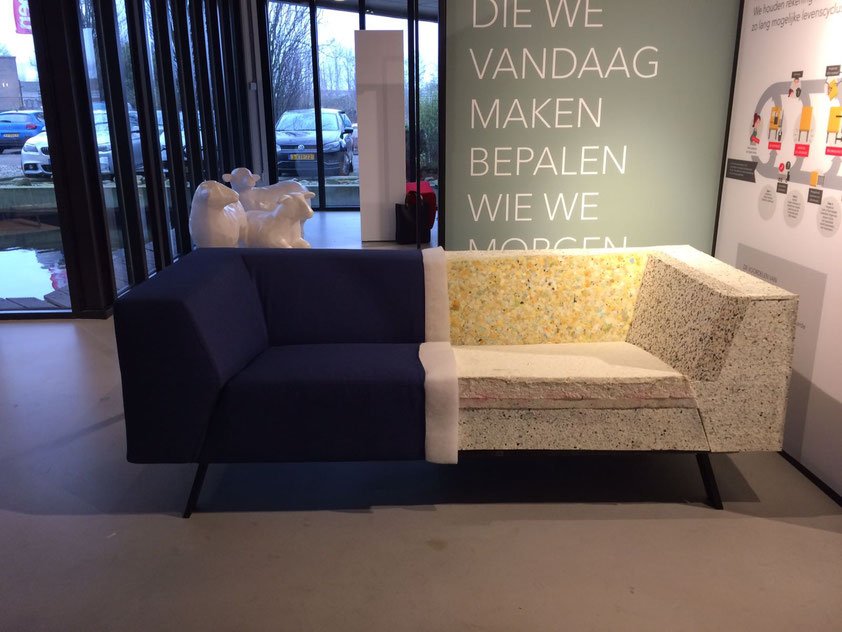 Het ontwerpen van producten die gemaakt zijn van 100% gerecycled plastic begon bij de meubelfabrikant Gispen in Culemborg. “Omdat je ergens moet gaan beginnen ben ik aan de slag gegaan met de meubelindustrie. Ik ben naar Culemborg gegaan omdat daar veel meubelindustrie zit en werd direct enthousiast ontvangen. De gemeente wilde direct meewerken en de afhaalophaaldienst ook. Omdat ze bij Gispen zelf ook niet wisten waar ze moesten beginnen heb ik gezegd: ‘Pak nou het best lopende model bank en dan gaan we daar mee aan de slag. Over drie maanden staat dat model er van 100% gerecycled plastic.’ Ze dachten waarschijnlijk die is gek, die heeft geen verstand van ontwerpen en materialen, dat heb ik ook niet, maar de productontwerpers wel en die heb ik dan ook hun gang laten gaan. Drie maanden later stond de bank er inderdaad en nu zijn we aan het door ontwikkelen, dit jaar worden er nog 200 van gemaakt.”