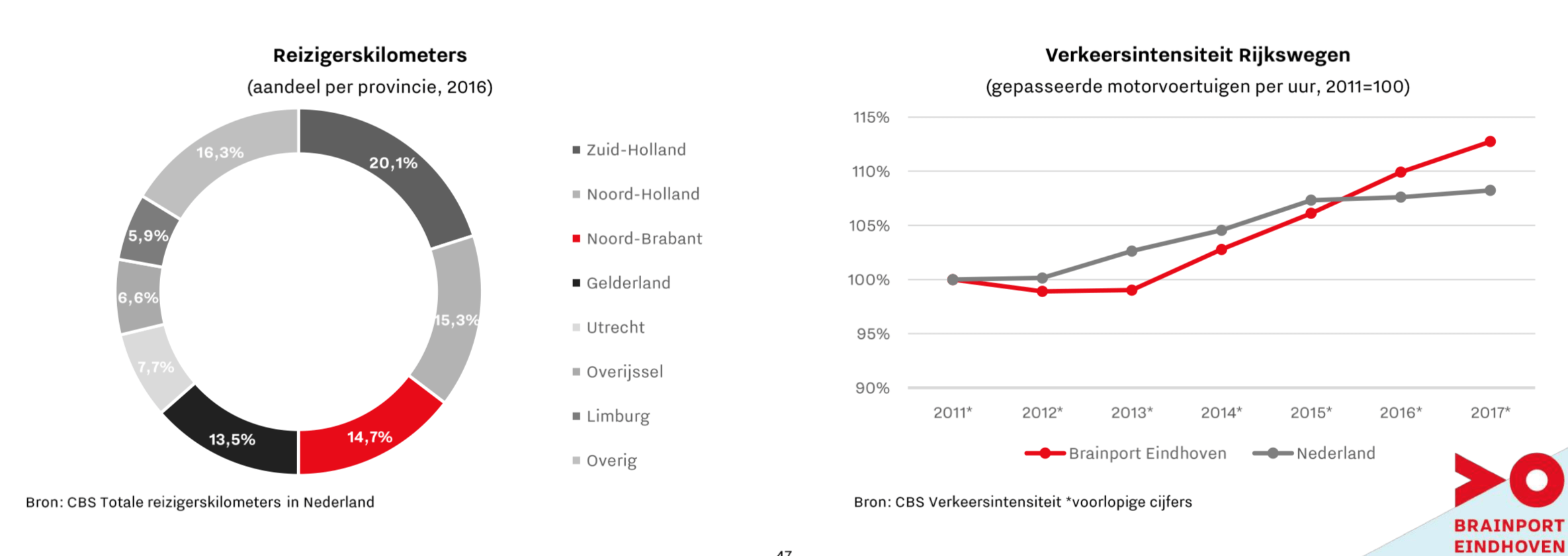 Niet zo vreemd dus dat de wegen behoorlijk vol zijn. In 2017 passeren regionaal gemiddeld 2.671 motorvoertuigen per uur, terwijl dit aantal op nationaal niveau gemiddeld op 2.261 motorvoertuigen ligt. De stijging is in Brainport Eindhoven ook hoger (+2,6%) dan landelijk (+0,5%).