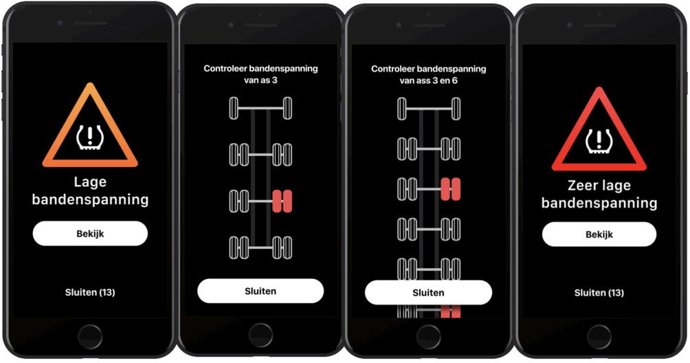 Om te voorkomen dat chauffeurs direct op de smartphones gaan kijken, verschijnt op het scherm een herkenbaar icoontje. Zodra de chauffeur stil staat, kan in de app bekeken worden welke band een afwijkende spanning heeft.