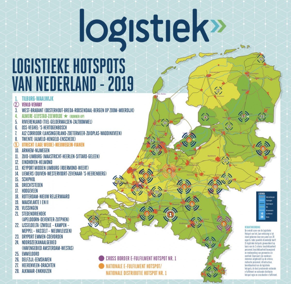 Vorig jaar was de regio Tilburg-Waalwijk er al dichtbij, maar in 2019 is het dan echt gelukt: de midden-Brabantse regio is uitgeroepen tot Logistieke Hotspot van het Jaar. In een enquête – een initiatief van Logistiek.nl – gaf een panel logistieke experts Tilburg-Waalwijk de meeste stemmen. Op plaats twee eindigt Venlo-Venray. West-Brabant, dat de twee voorgaande edities won, zakt naar plaats 3. Met plaats 4 is Almere-Lelystad-Zeewolde dit jaar de opvallendste stijger. Onder aanvoering van Midpoint Brabant wil Tilburg-Waalwijk zich nu meer en meer gaan richten op ‘smart logistics’.