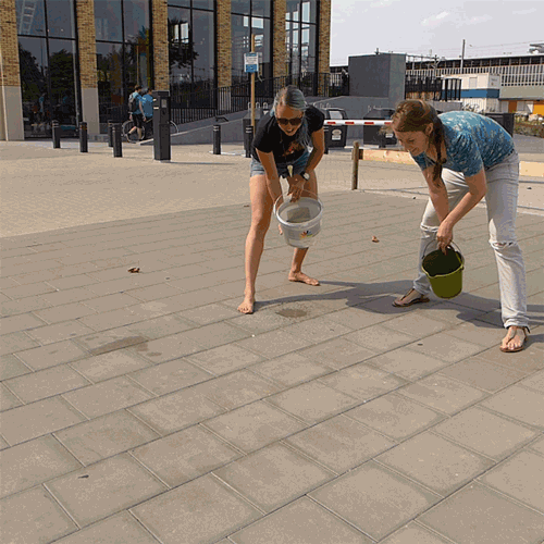 Coppes legt uit hoe ze te werk gingen: “Een stoep wordt donkerder van kleur als het regent. De hydrofobe coating voorkomt dat een oppervlak nat wordt. Door de coating over een stencil te spuiten, creëer je gebieden die water afstoten en droog blijven. Als het regent wordt het contrast tussen de droge, lichte stoep en de donkere natte stoep zichtbaar. De coating is onzichtbaar wanneer deze droog is, en is milieu-vriendelijk en biologisch afbreekbaar. Volgend de fabricant zouden de werken 2 tot 4 maanden zichtbaar moeten blijven, en dan langzaam wegvagen.”