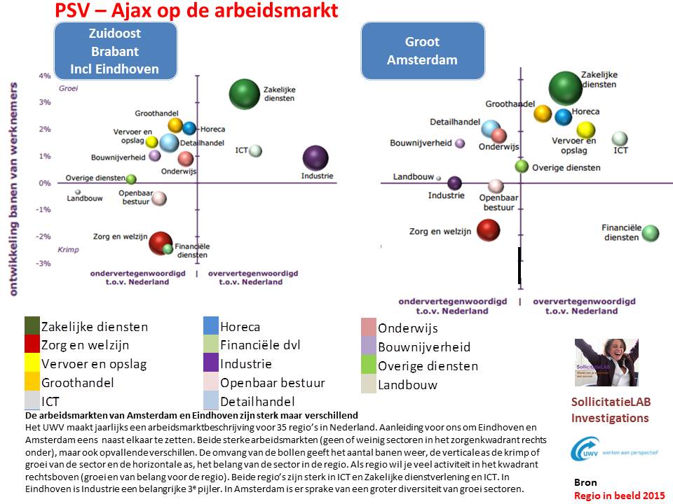 Vandaag PSV-Ajax, de wedstrijd die mogelijk een voorbode is van de eindstand in de eredivisie. Aanleiding voor Sollicitatielab om – op basis van cijfers van het UWV – de arbeidsmarkt van Eindhoven en Amsterdam eens met elkaar te vergelijken. Er zijn overeenkomsten maar ook grote verschillen.